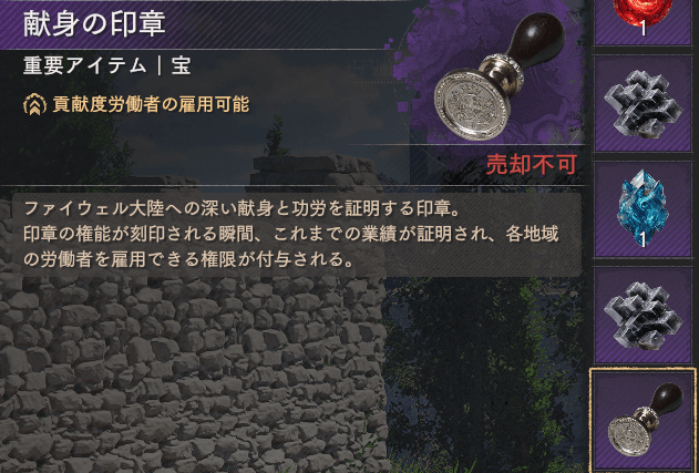 「献身の印象」を使用すると、永続的に貢献度労働者を雇用できるので、早めに入手、使用しておきたい。