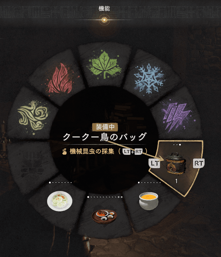 特殊な動作を行うアイテムを持っている場合、右キーのリングメニュー(機能)のから選択することで、ショートカット発動できます。