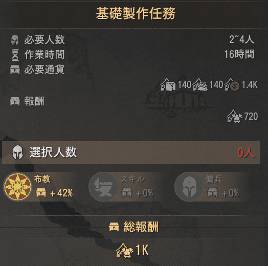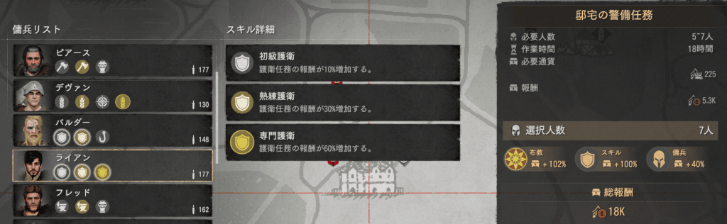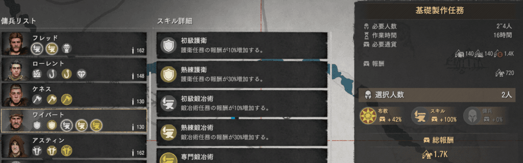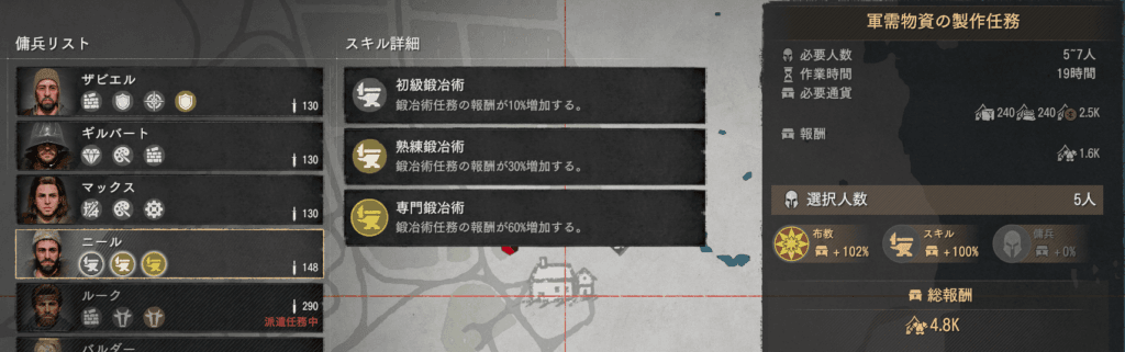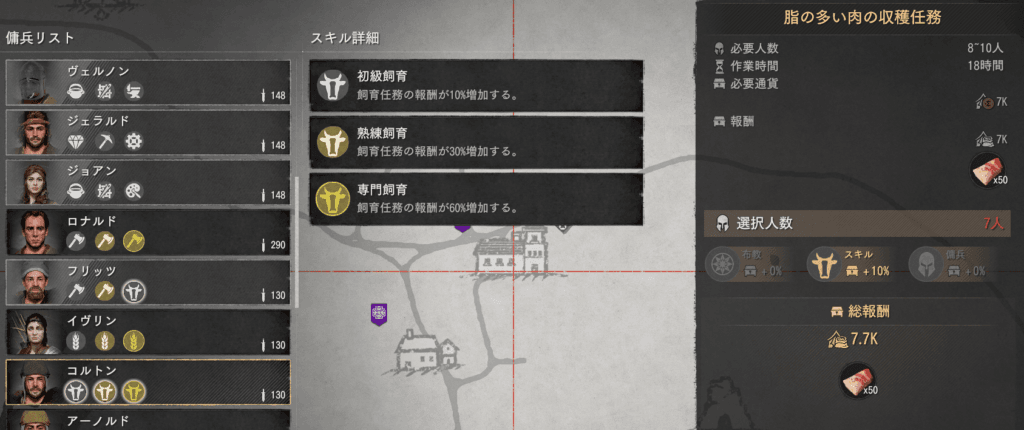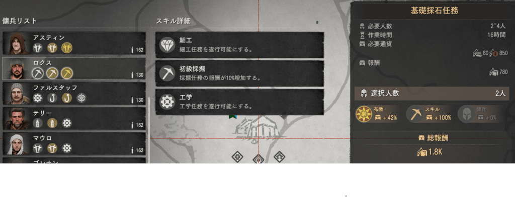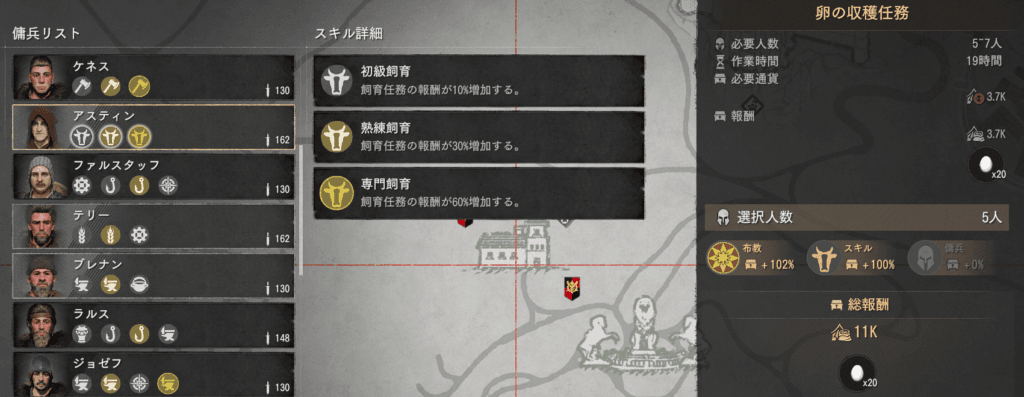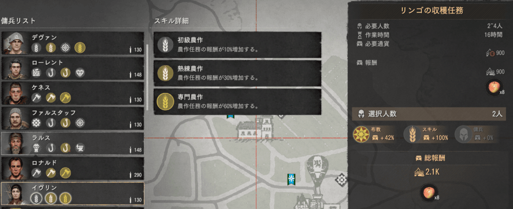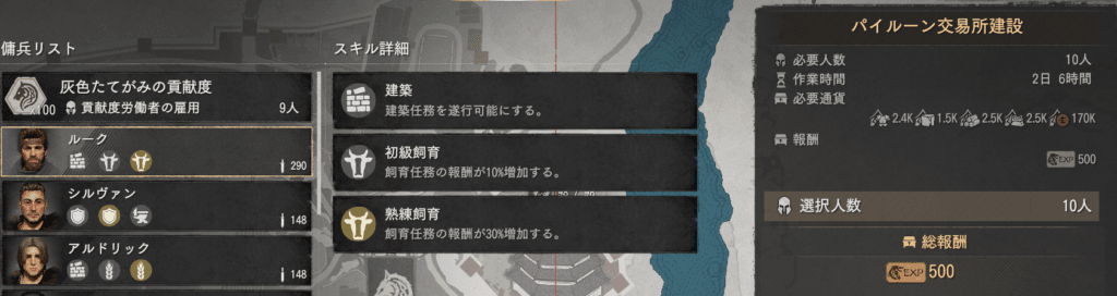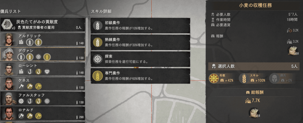 10人必要な任務も、1人(必要スキル持ちの団員)+9人(貢献度労働者)で行える。