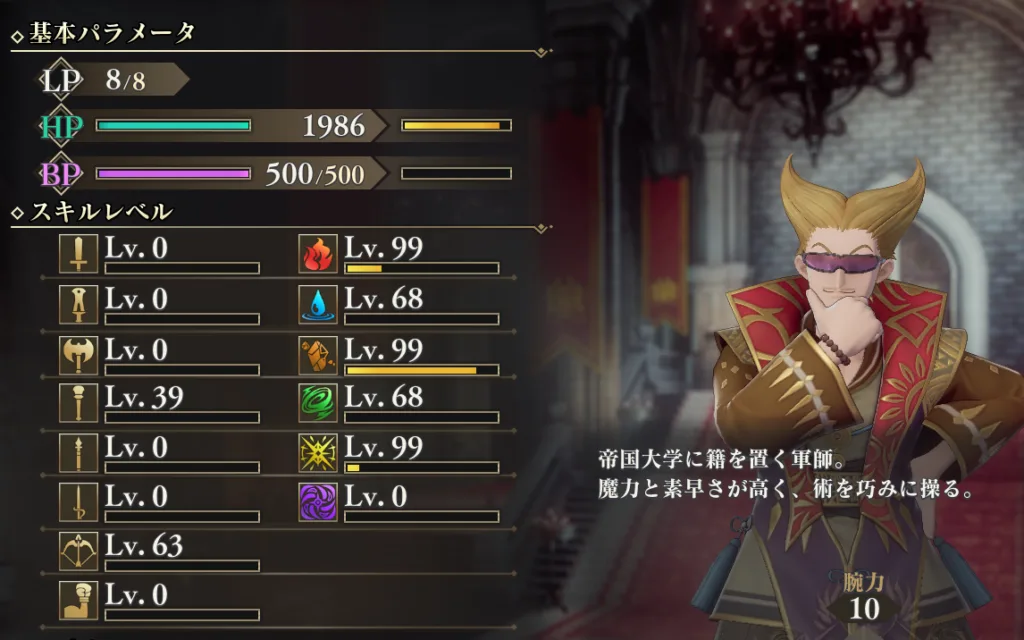 武器は小剣なら適正が高いのですが、7英雄武器の蟲惑の小剣の固有スキルがテンプテーション(攻撃力25)と弱く、通常スキルの最強技がファイナルレター(攻撃力38)なので器用さは不要。