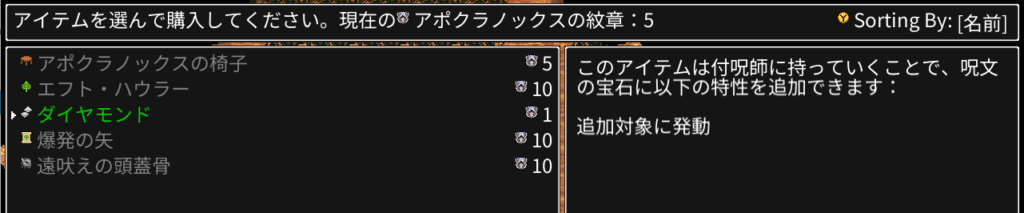 特性付与には宝石(ダイヤ等)が必要で、各レルムの神々のショップでメダルと交換して入手。