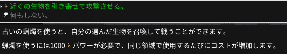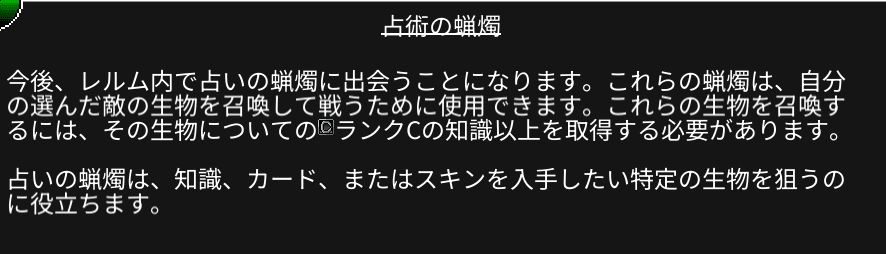 占術の蝋燭を探索中に使用することで、対象のクリーチャー6体の敵が5ユニット出現し、知識を集めることができる。