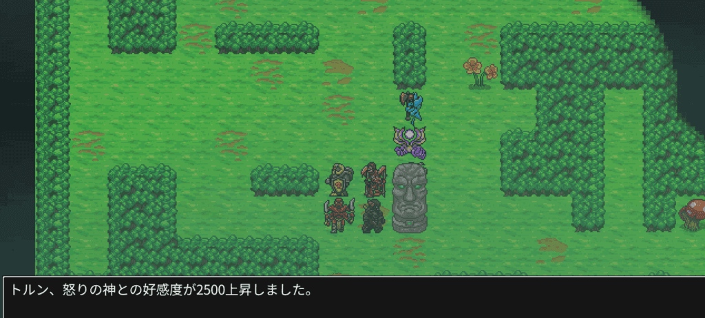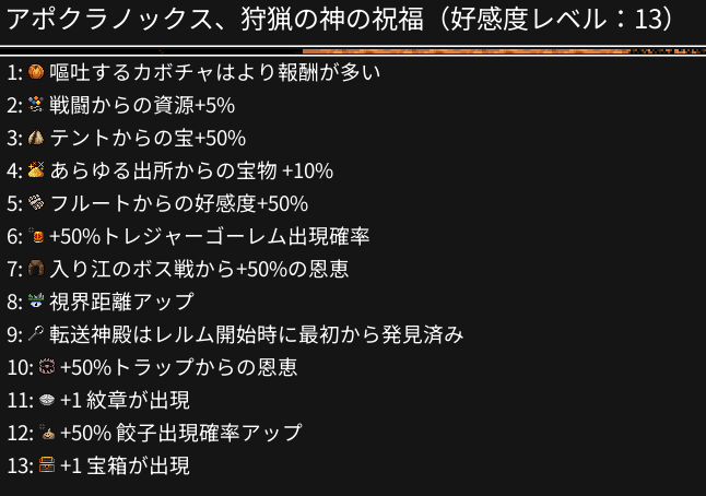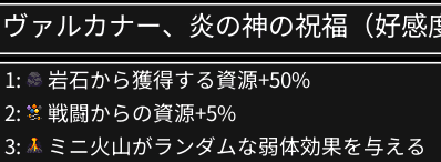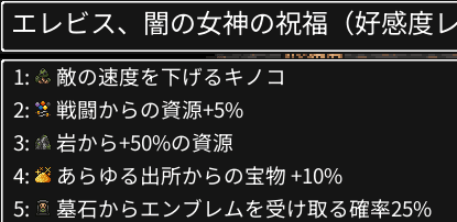 信仰(好感度)3で岩の資源増加、ランク4で宝物、5でエンブレムの獲得バフ。