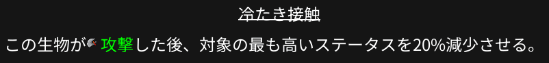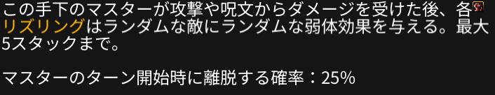 | ナイトテイカー | 1 | 敵は所持している弱体効果1つにつき、与えるダメージが5%減少する。 |