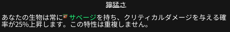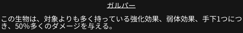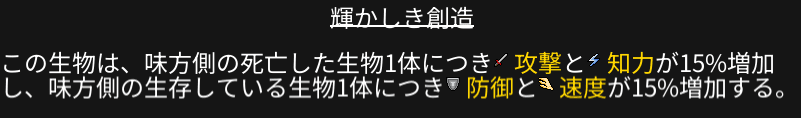 | 自然の恵み | 10 | 生物はバフを1つ持つごとに、体力以外のステータスが(ランクごと)%上昇する。 |