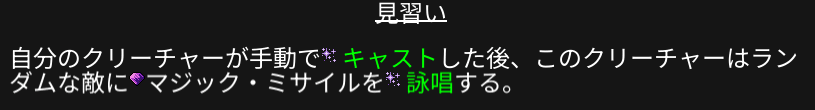 | 使い魔 | 25 | あなたのクリーチャーがエーテルスペルジェムを唱えた後、(ランク×2)%の確率でアニメーテッドジェムを召喚します。 アニメーテッドジェムの主人が手動で呪文を【詠唱】した後、このしもべは主人の呪文の宝石の中からランダムに選ばれた1つを【詠唱】する。 |
