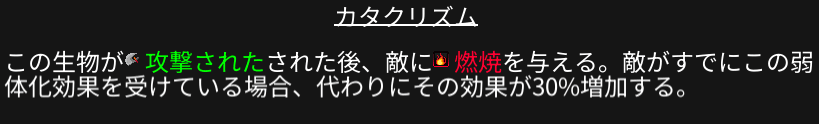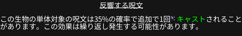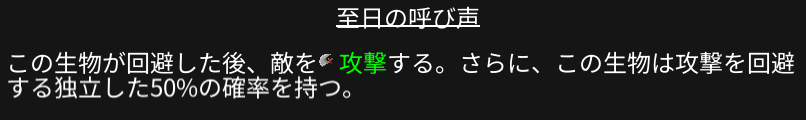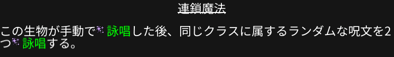 | アンダートウ(ascension) | 1 | 各敵のターン開始時、あなたの「根の呪文」「眠りの呪文」「霜の呪文」の特性が発動する確率が10%あります。 この確率は毎ターン10%上昇し、発動したあと10%にリセットされる。 |