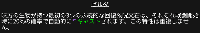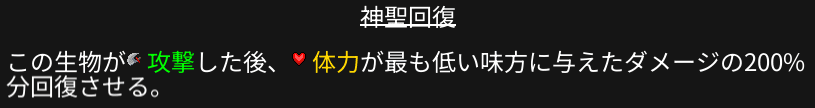 | 神聖なる力 | 25 | 生物が回復した後、回復量の(ランクごと)%に等しい攻撃と知力を獲得する。 |