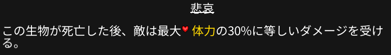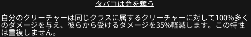 | 死に栄える | 50 | 自分のクリーチャーが倒された後、自分のアニマタスはそれらのステータスの(ランクごと)%を獲得する。 |