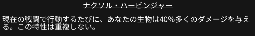 | 死の報い(ascension) | 1 | 自分のクリーチャーは、攻撃や呪文で、自身の最も高いステータスが相手の最も高いステータスを上回る分だけ追加ダメージを与える。 |