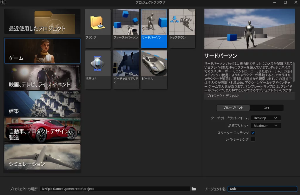 サードパーソンだと、デフォルトでキー入力マッピングがあったり、GameModeファイルも使いまわせるので初心者にはブランクで始めるより楽です。