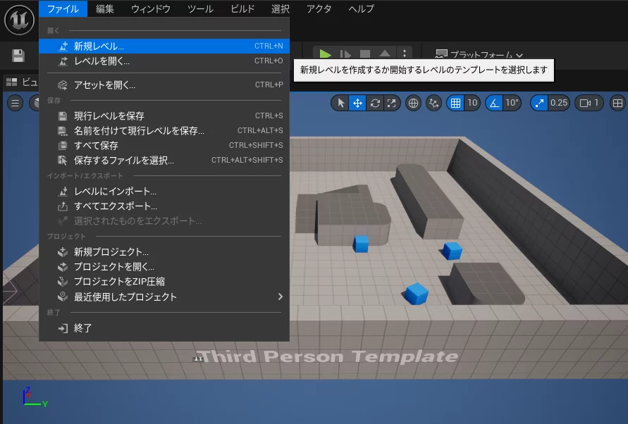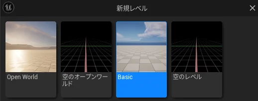 最初に配置されているインスタンスは使用しないので、新規レベルを開く。