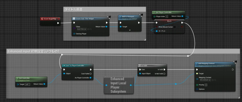 ①Create WidgetとAdd to Viewportでタイトル画面(これから作成)表示