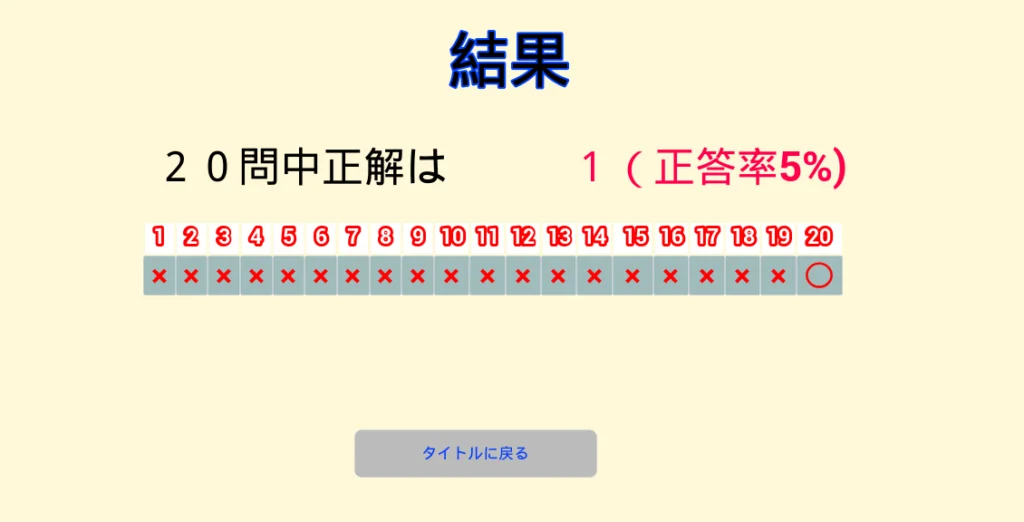 ただ、現在はまだ正式な形ではなく、デフォルト値(問題番号1~20とデフォルトの〇×)を表示しているだけです。